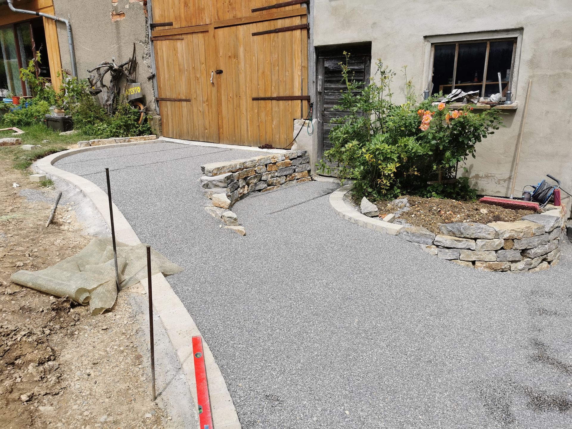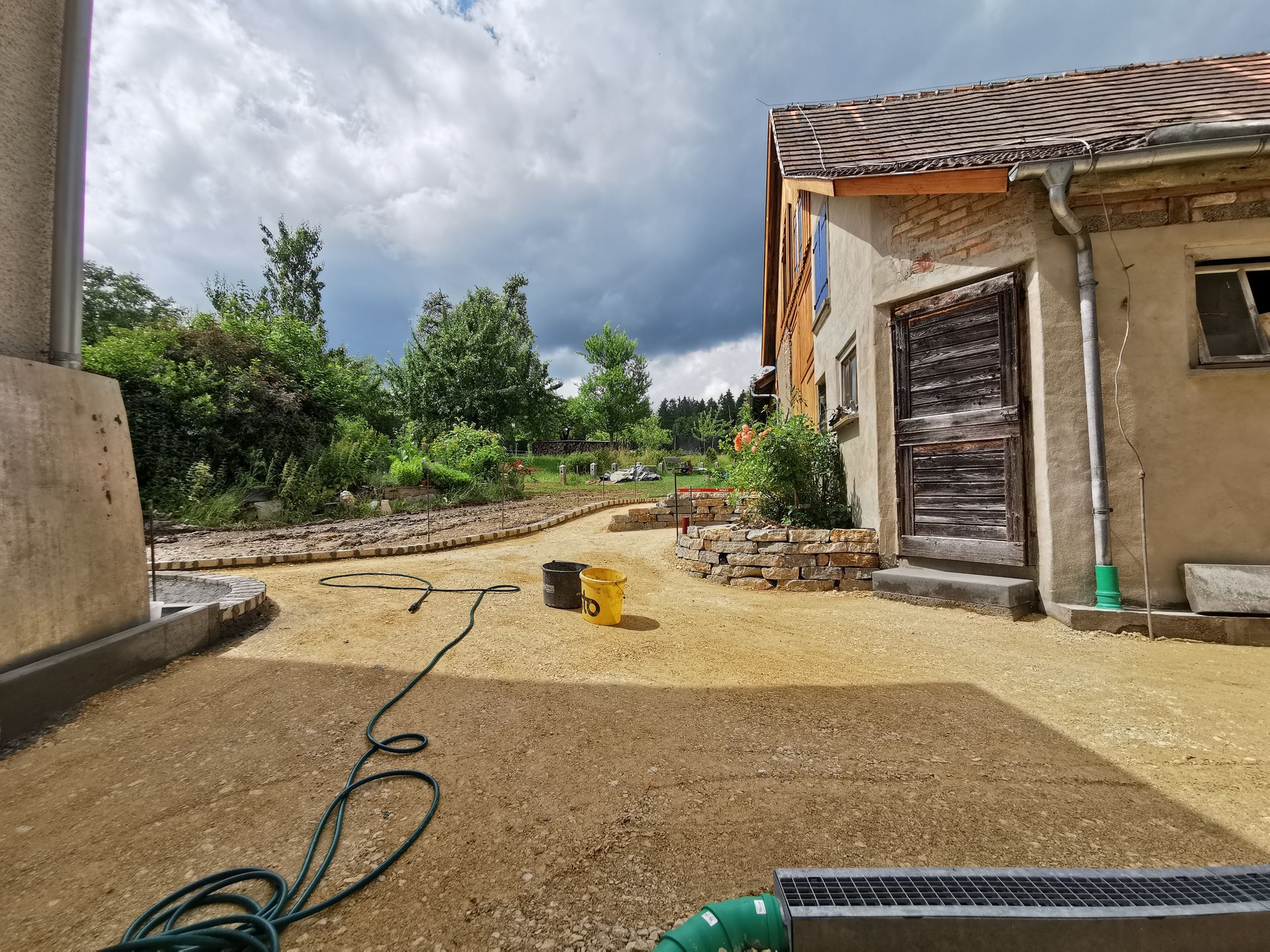 Herausforderungen waren die vielen verschiedenen Höhen der Eingangstüren und die Entwässerung des Innenhofs, der den tiefsten Punkt hinter dem Bauernhaus bildet.